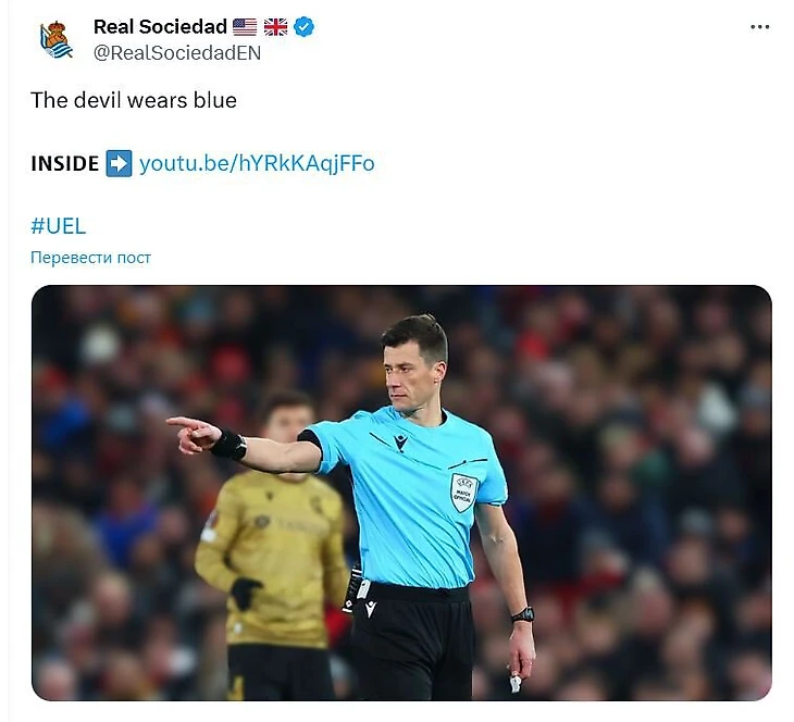«Дьявол носит голубое». «Сосьедад» выложил фото судьи Бастьена после вылета от «МЮ» из-за голов Бруну с пенальти