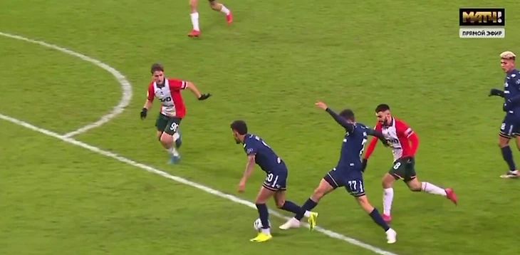 Макаров принял мяч и прокинул его дальше, но траекторию ему пересек Бителло. В итоге Денис сделал подсечку бразильцу, выходившему на ударную позицию в штрафной.