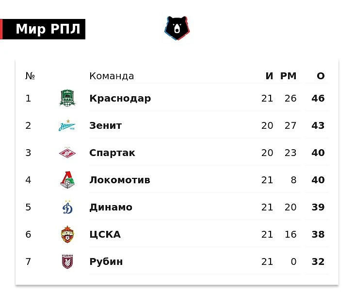 «Быки» набрали 46 очков и лидируют в таблице. «Зенит» отстает на 3 очка, «Спартак» – на 6, и эти команды встретятся сегодня вечером.