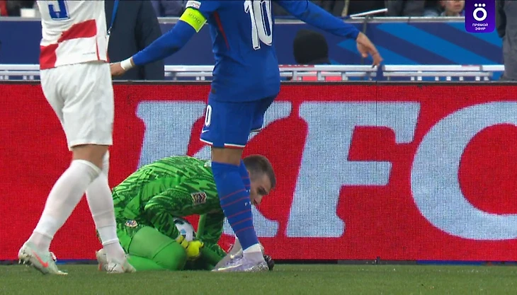 На 37-й минуте ответного матча 1/4 финала Лиги наций форвард сборной Франции ударил хорватского голкипера коленом в плечо в попытке выбить мяч у него из рук. После этого Ливакович упал на газон, закрывая лицо руками.