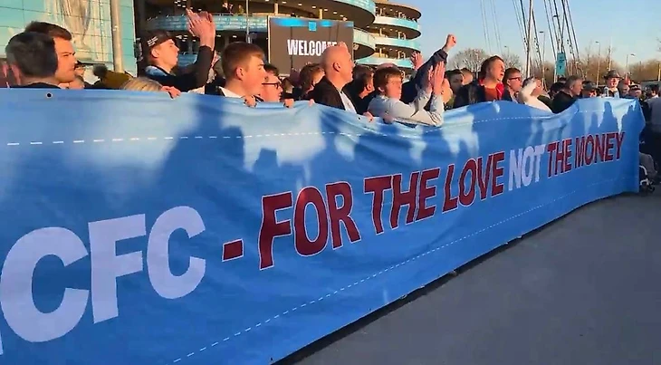 На видео, выложенном в соцсетях Саймоном Стоуном из BBC, видно, что болельщики пришли с огромным баннером с надписью: «Манчестер Сити – по любви, а не ради денег». Фанаты исполняли кричалки рядом с «Этихад Стэдиум», в которых, в частности, признавались в любви к клубу.