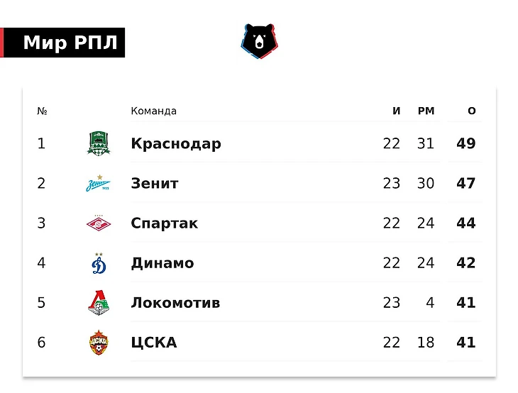 После зимней паузы действующие чемпионы России провели в Мир РПЛ 5 игр. Они победили «Факел» (2:0) и «Рубин» (4:0), сыграли вничью с ЦСКА (0:0) и «Локо» (1:1), а также уступили «Спартаку» (1:2).