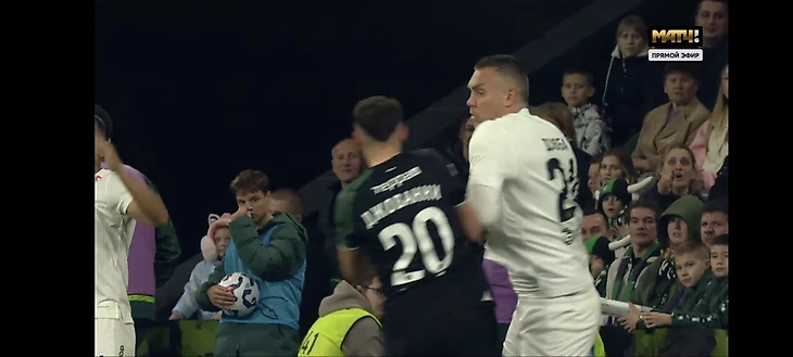 Дзюба сцепился с Гонсалесом перед аутом. Защитник «Краснодара» обхватил Артема руками, форвард «Акрона» схватил его за шею и оттолкнул