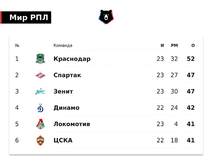 Лидирует в чемпионате России «Краснодар» – у него 52 очка.