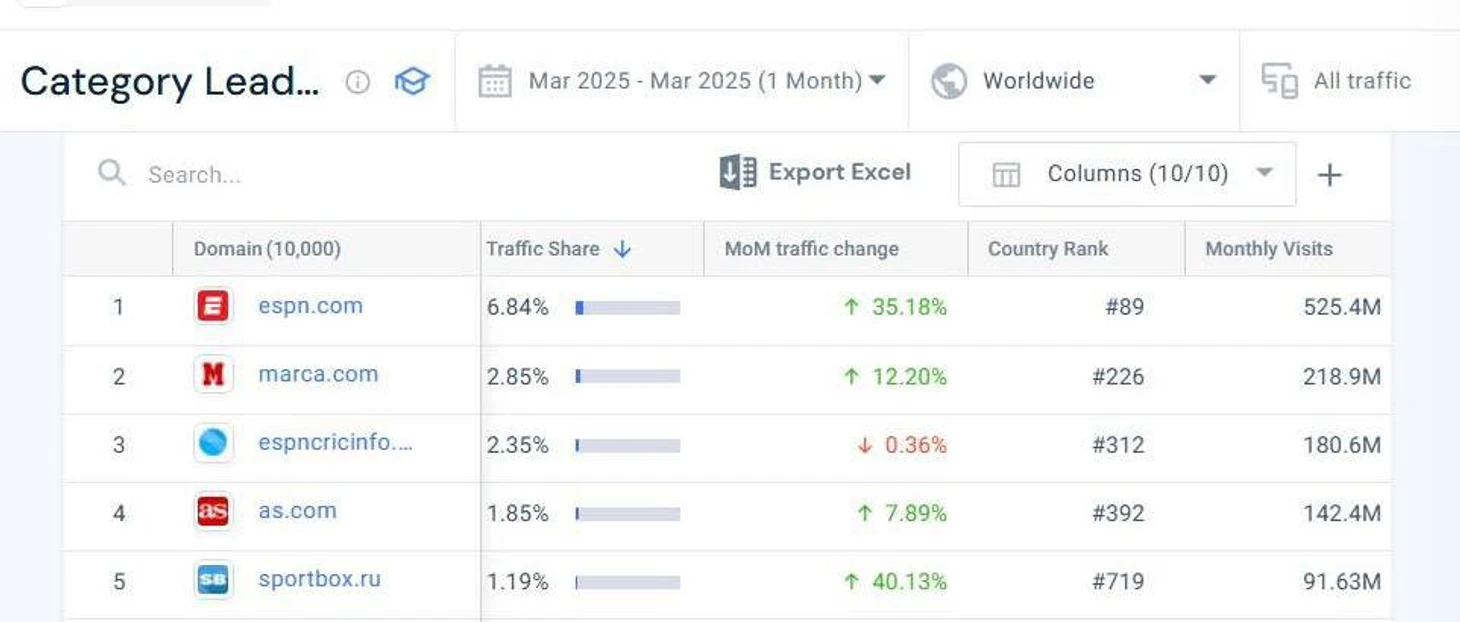 Конов приложил скриншот со статистикой, где указано, что по итогам месяца у Sportbox 91,63 млн посещений. Первое место занимает ESPN (525,4 млн), второе – испанская Mаrca (218,9 млн), третье – ESPNcricinfo (180,6 млн), четвертое – испанская AS (142,4 млн).