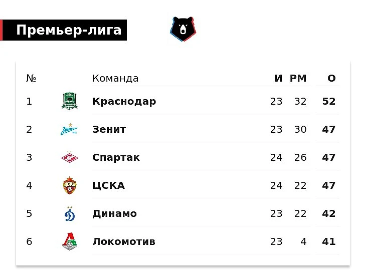 «Краснодар» лидирует в таблице Мир РПЛ, набрав 52 балла.