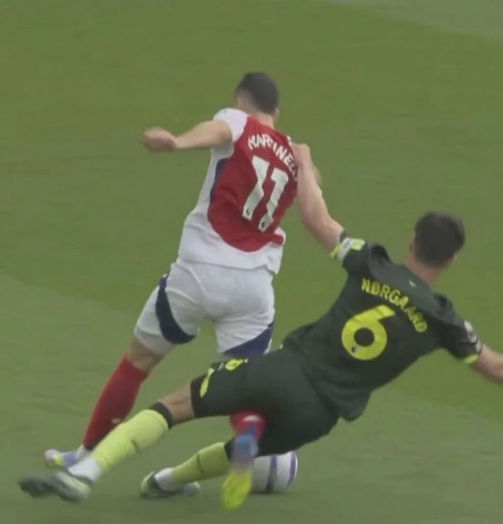 «Арсенал» дома сыграл вничью с «Брентфордом» в 32-м туре АПЛ (1:1). На 29-й минуте полузащитник гостей Кристиан Нергор сбил вингера хозяев в подкате, зажав его ногу своими двумя ногами. Главный арбитр Саймон Хупер показал датчанину желтую карточку, ВАР не стал вмешиваться.