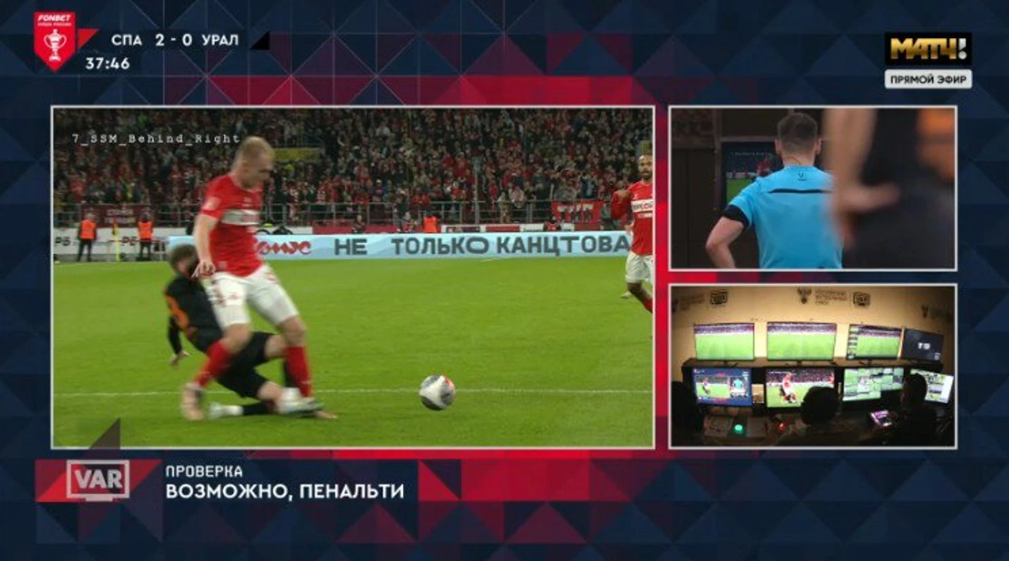 На 36-й минуте полузащитник гостей Никита Морозов сбил Даниила Денисова в штрафной площади. После просмотра видеоповтора эпизода главный арбитр Евгений Кукуляк назначил 11-метровый в ворота «Урала». Эсекиэль Барко с точки забил 3-й гол «Спартака» в матче.