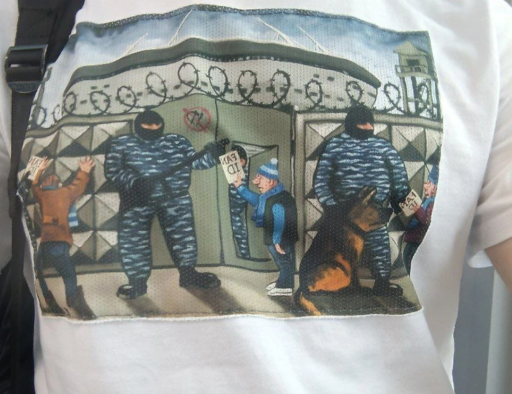 Одному из болельщиков не разрешили пройти на стадион из-за рисунка на его футболке. На ней «Газпром Арена» изображена за забором с колючей проволокой, а болельщиков, желающих пройти на стадион, досматривают сотрудники полиции в масках.