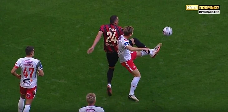Главный арбитр Алексей Сухой сперва не назначил пенальти, однако после вмешательства ВАР отправился к монитору, изучил повтор, изменил решение и поставил 11-метровый.