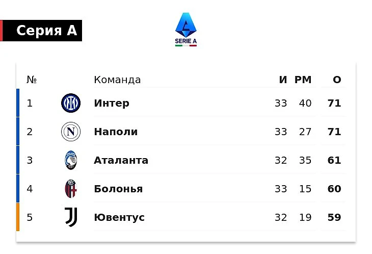 Третьей в Серии А идет «Аталанта», набравшая 61 очко в 32 матчах – сегодня команда из Бергами сыграет с «Миланом». Четвертую строчку занимает «Болонья», пятую – «Ювентус», который завтра сыграет с «Пармой».