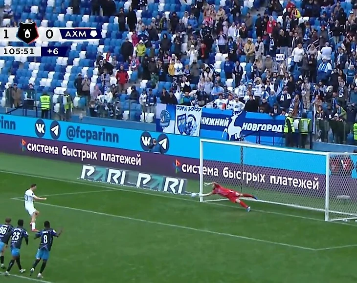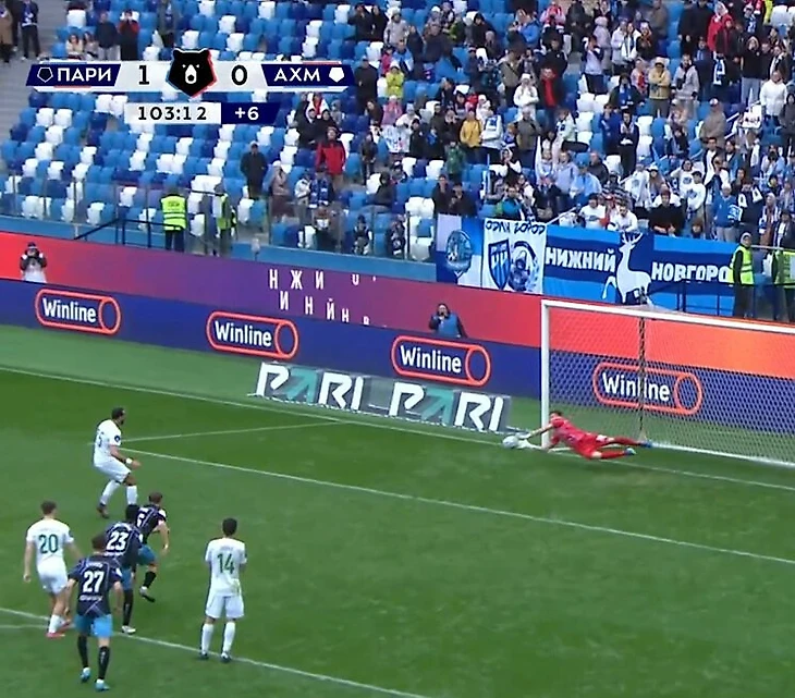 Медведев отразил 2 пенальти от «Ахмата» – на 104-й и 106-й при 1:0. Судьи дали перебить грозненцам 1-й удар за выход вратаря «Пари НН» с линии ворот