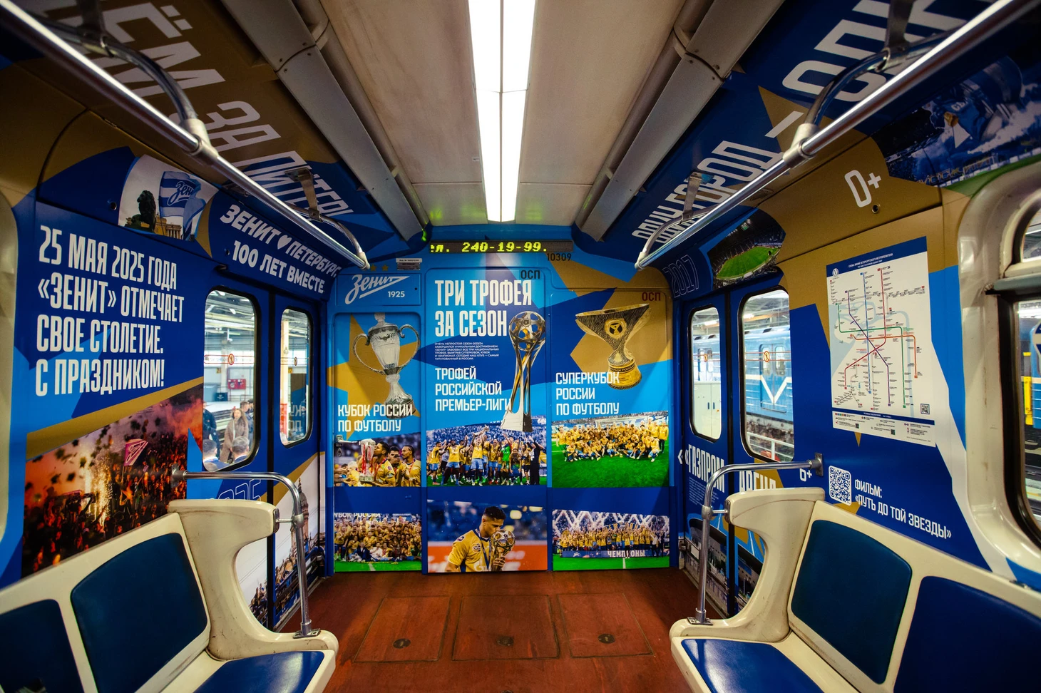 «Столетний юбилей «Зенита» – праздник клуба и всего Петербурга. В честь знакового события сине-бело-голубые и «Газпром» создали по-настоящему уникальную ливрею и внутреннее оформление вагонов одного из составов метрополитена. Его главная задача – познакомить жителей и гостей лучшего города мира с историей сине-бело-голубых, в том числе с помощью интерактивных элементов: для этого внедрены QR-коды со ссылками на клубные подкасты и аудиокнигу Леонида Иванова.