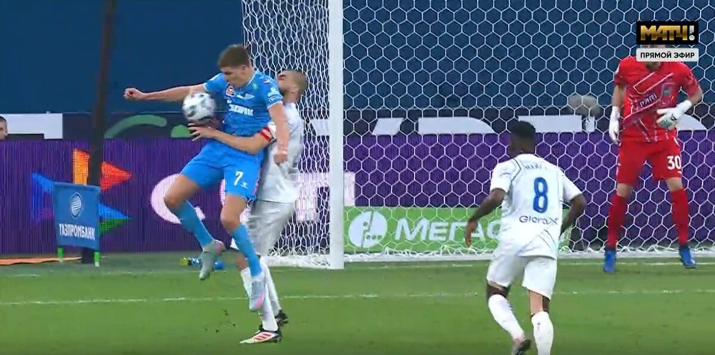 «Ошибается Карасев и не назначает 11-метровый удар ворота команды «Пари НН» за игру рукой. Рука игрока «Пари НН» была [выставлена] вперед, в которую попал мяч.