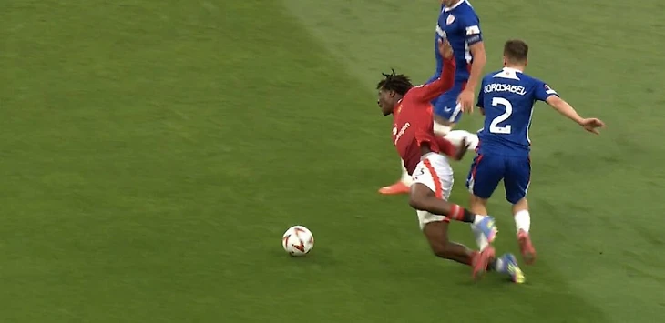 На 22-й минуте ответного полуфинала Лиги Европы защитник «Манчестер Юнайтед» упал в штрафной соперника в борьбе с Андони Горосабелем.