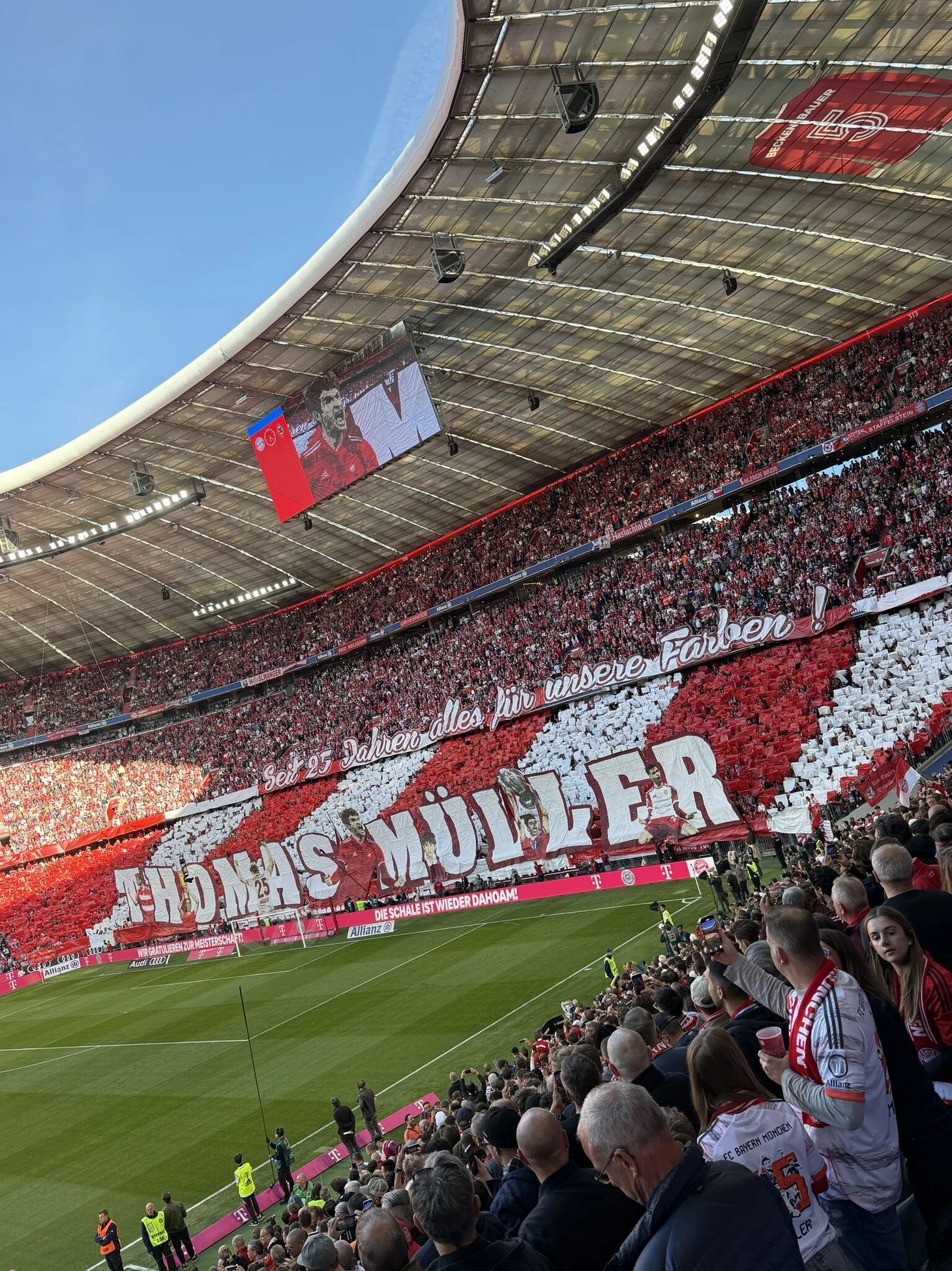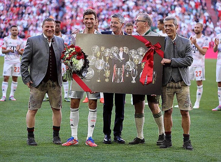 Мюллеру вручили полотно, на котором он изображен в окружении завоеванных трофеев. Болельщики же растянули на трибунах надпись: «25 лет делал все для наших цветов – Томас Мюллер!»