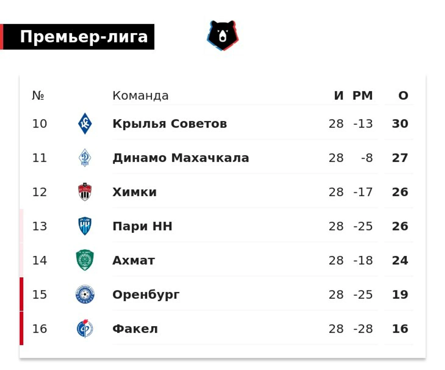 За 2 тура до окончания Мир РПЛ «Химки» занимают 12-е место в таблице, набрав 26 очков в 28 матчах.