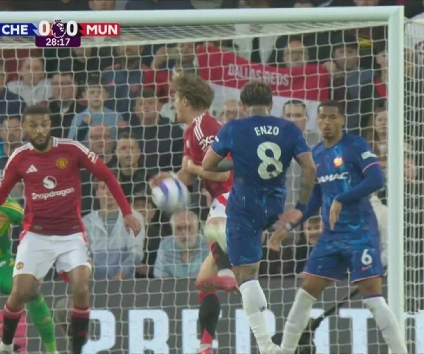 На 29-й минуте полузащитник «синих» Энцо Фернандес с лета пробил по воротам из пределов штрафной «Юнайтед». Форвард гостей Расмус Хейлунд встал на пути мяча. Он отворачивался, и мяч попал в руку датчанину.