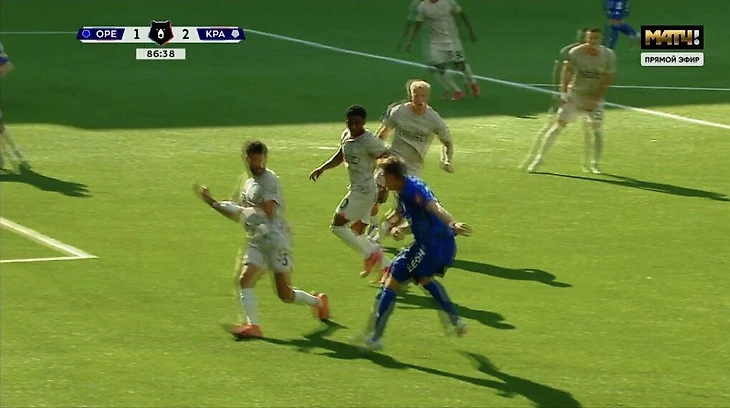 Мяч попал в руку в штрафной «Краснодара» на 87-й минуте игры с «Оренбургом».