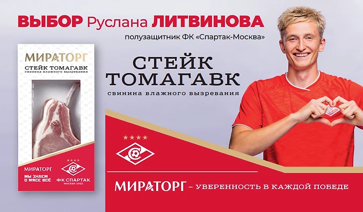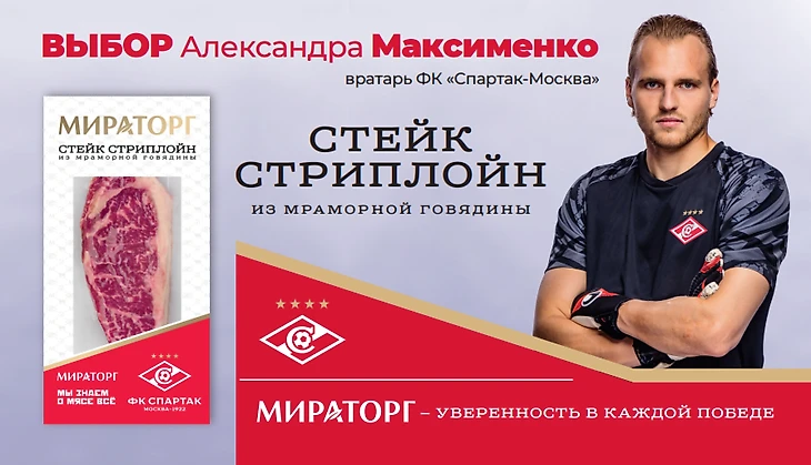 Игроки «Спартака» прорекламировали стейки «Мираторг». Максименко выбрал Стриплойн, Литвинов – Томагавк, Зобнин – Чак ролл: «Обладает потрясающей сочностью и выраженным вкусом»