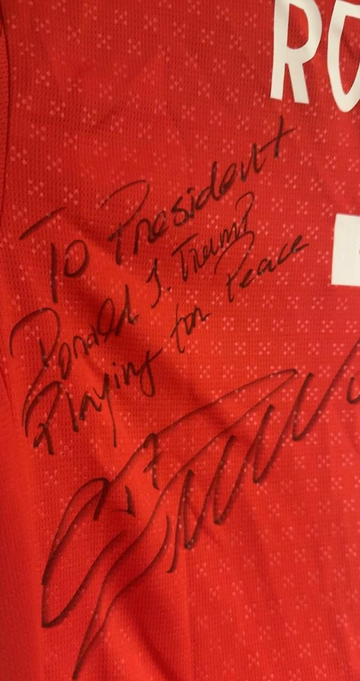 Роналду оставил на футболке следующие слова: «Президенту Дональду Трампу, выступающему за мир».