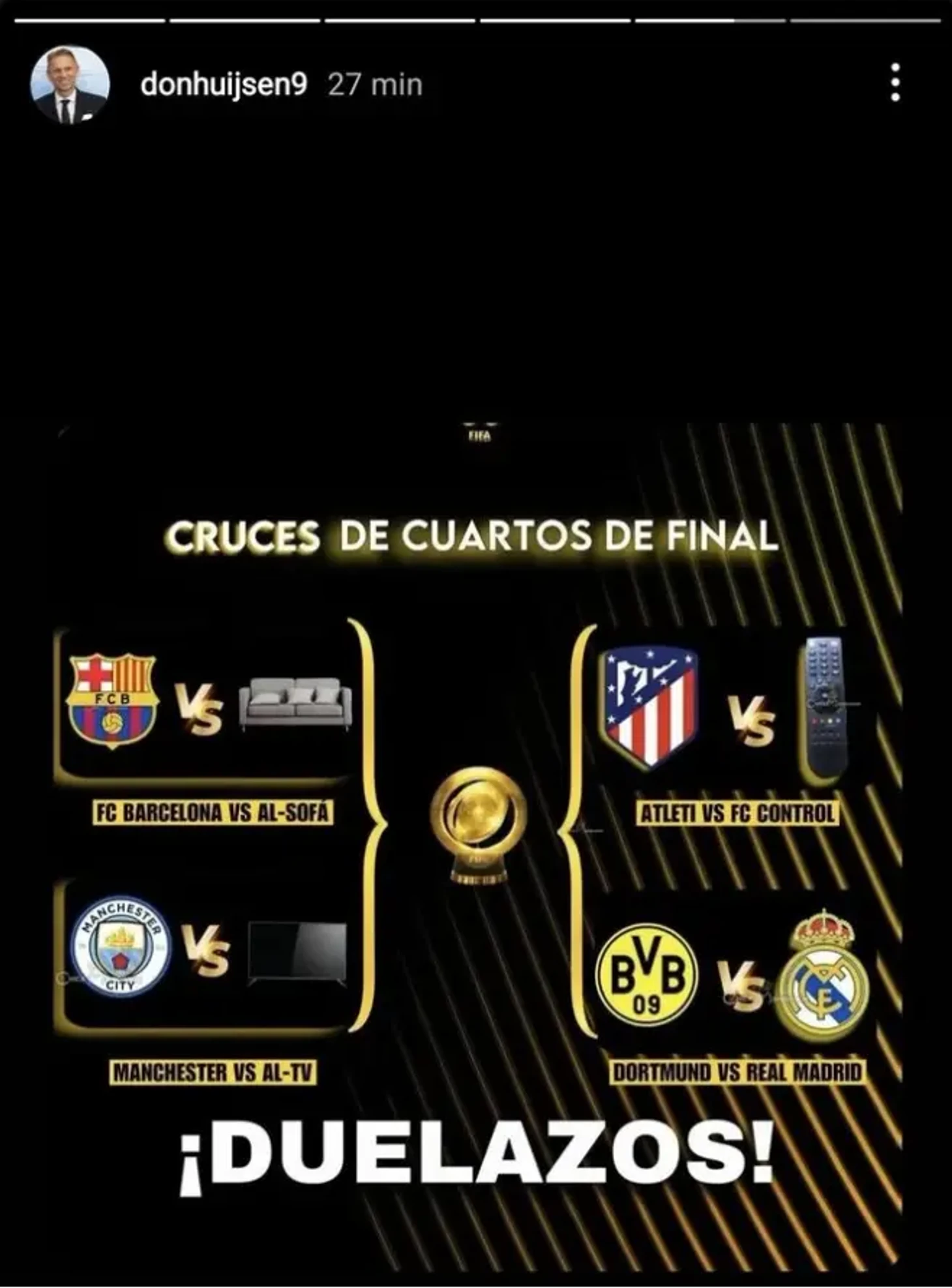 На опубликованном изображении показано, что в 1/4 финала «Реал» сыграет с «Боруссией» Дортмунд, «Барселона» – с «Аль-Софой» (диваном), «Атлетико» – с ФК «Пульт» (пультом от телевизора), а «Манчестер Сити» – с «Аль-ТВ» (телевизором).