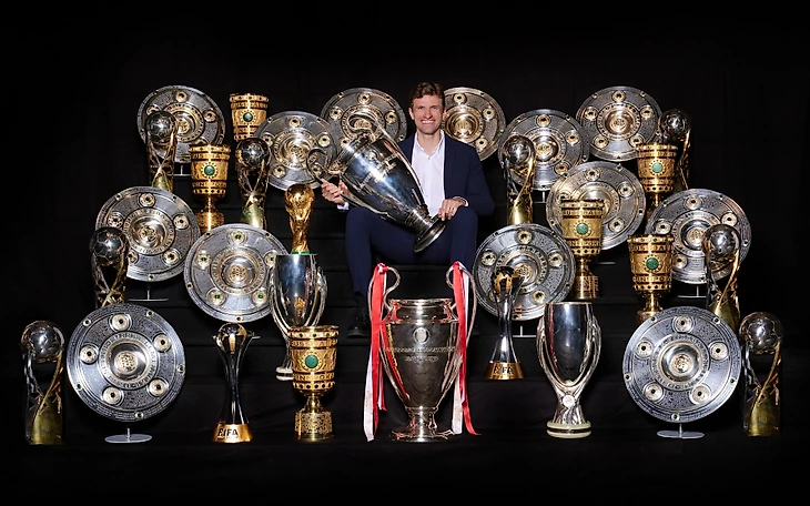 «Томас Мюллер. 13-кратный чемпион Германии. 6-кратный обладатель Кубка Германии. 2-кратный победитель Лиги чемпионов и клубного чемпионата мира. 8 Суперкубков Германии. 2 Суперкубка УЕФА.