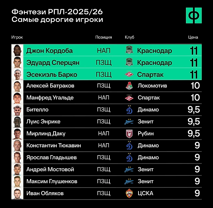 Форвард «Краснодара» Джон Кордоба, полузащитник «Краснодара» Эдуард Сперцян и хавбек «Спартака» Эсекиэль Барка – самые дорогие игроки в Фэнтези РПЛ на Спортсе’’ сезона-2025/26. Они стоят 11 млн.
