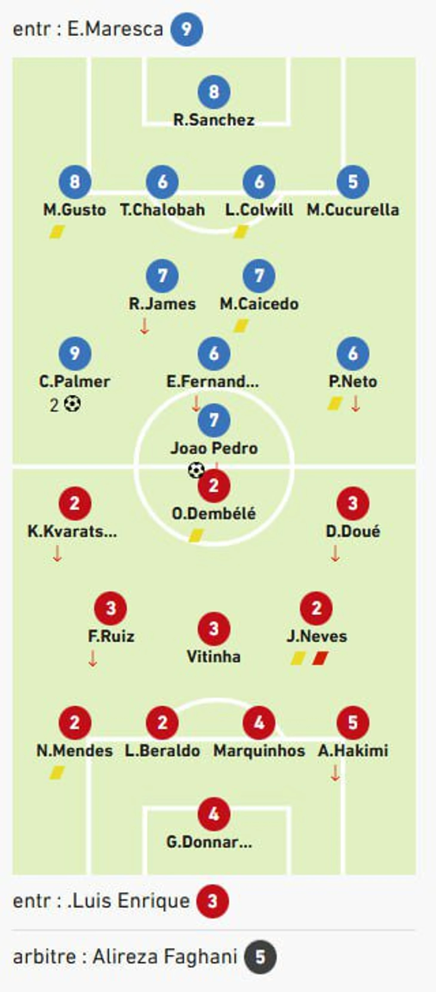 Самую высокую оценку среди участников матча получили главный тренер «Челси» Энцо Мареска и автор дубля и ассиста полузащитник Коул Палмер. Действия тренера «ПСЖ» Луиса Энрике оценили в 3 балла, а арбитра из Ирана Алирезы Фагани – в 5.