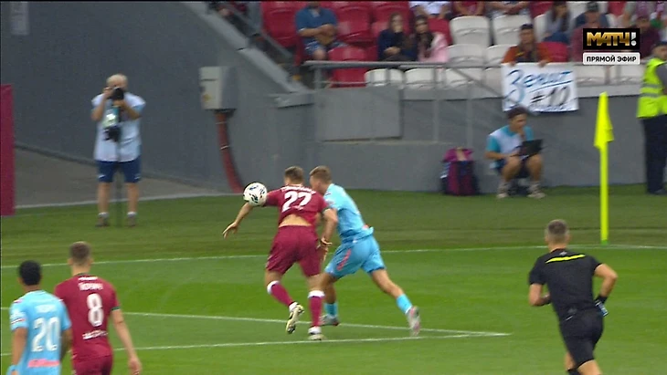На 7-й минуте мяч после заброса петербуржцев со своей половины попал в область локтя защитнику казанцев Алексею Грицаенко. 30-летний футболист в этот момент находился к мячу спиной и боролся за позицию с Максимом Глушенковым.