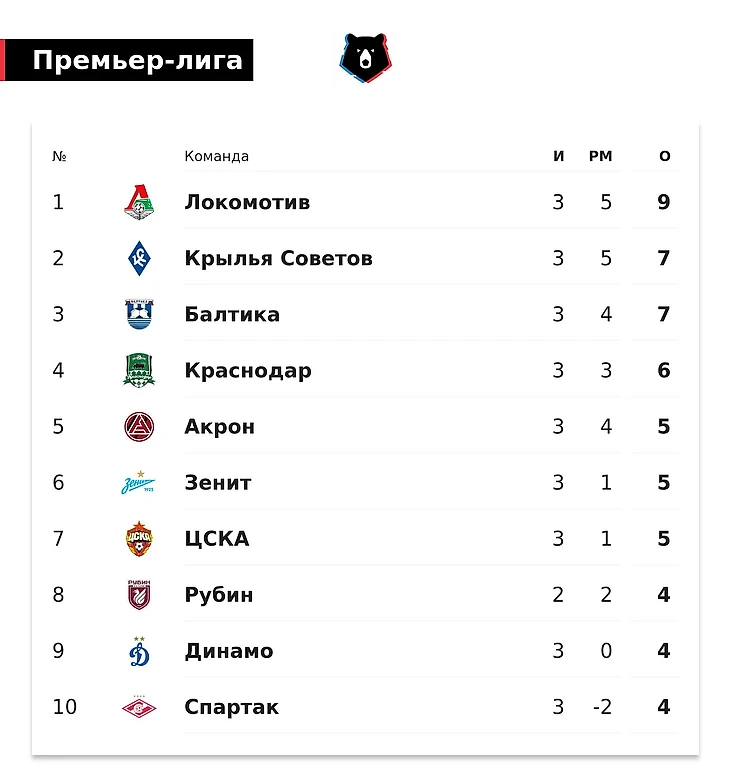«Зенит» и ЦСКА на 4 очка отстают от лидирующего «Локомотива» после 3 туров РПЛ. «Крылья Советов» и «Балтика» идут в топ-3 на данный момент, «Краснодар» – 4-й, «Спартак» – 10-й