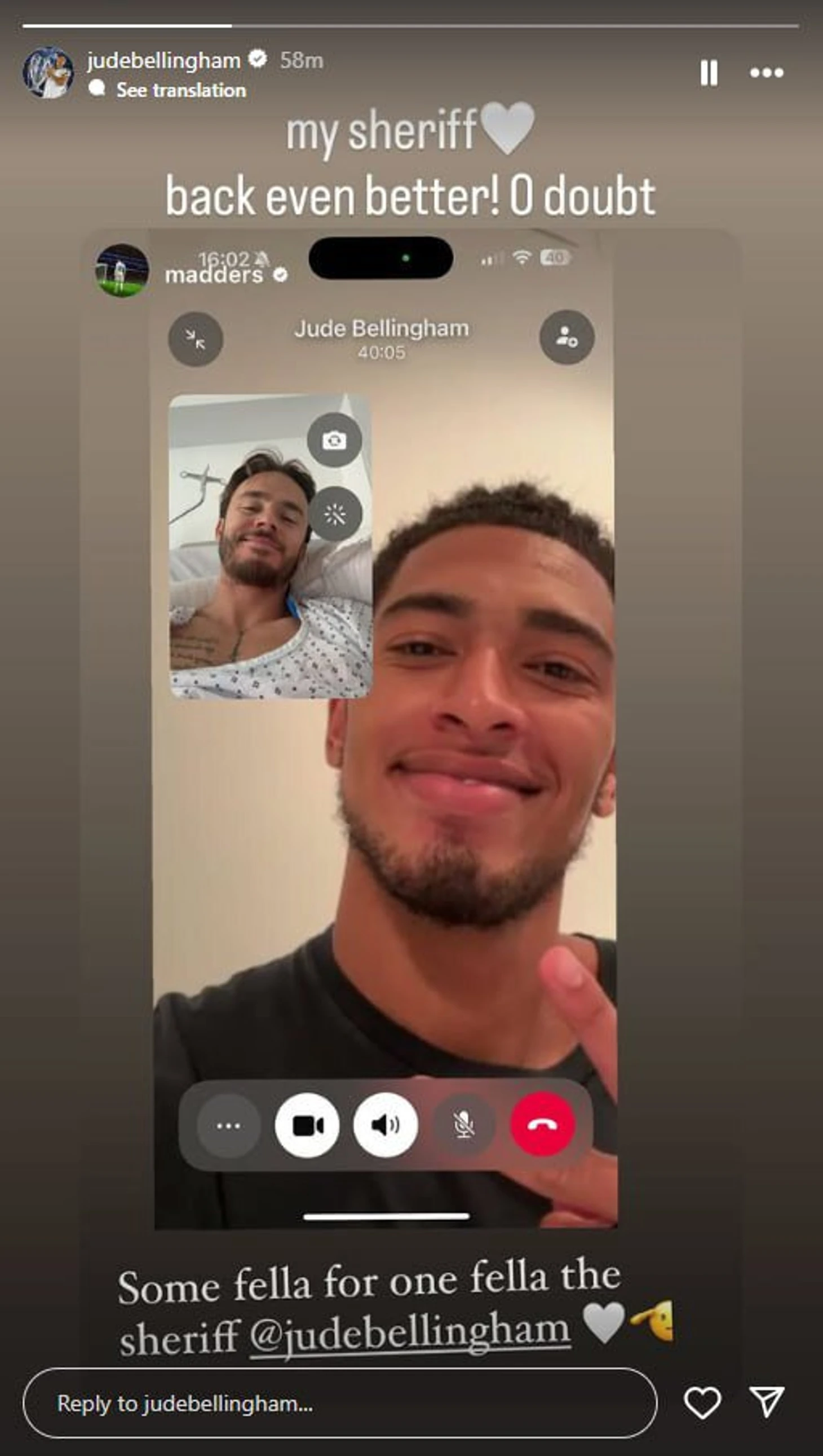 Полузащитник «Реала» Беллингем позвонил своему партнеру по сборной Англии по видеосвязи, чтобы поддержать его. Мэддисон выложил скриншот в сторис инстаграма.