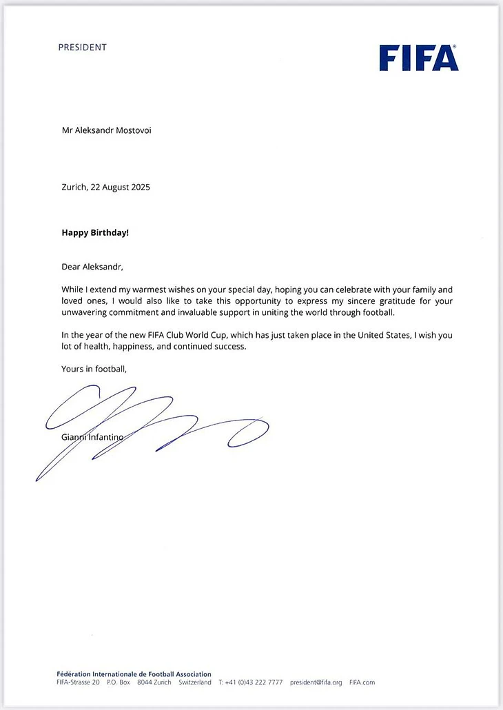 Мостовой опубликовал поздравительное письмо от президента ФИФА.