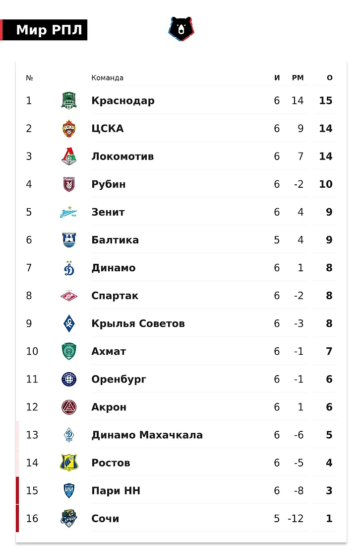 ЦСКА и «Локомотив» на 1 очко отстают от лидирующего «Краснодара» после 6 туров Мир РПЛ. «Зенит» – 5-й на данный момент, «Динамо» – 7-е, «Спартак» – 8-й