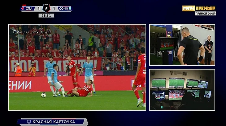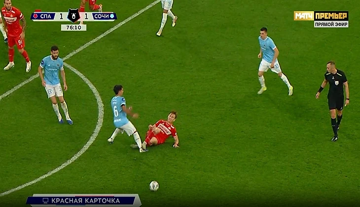Абросимов показал Умярову прямую красную в матче с «Сочи», но заменил ее на желтую после ВАР. Хавбек «Спартака» сыграл в мяч в подкате и попал шипами в ногу Сааведры
