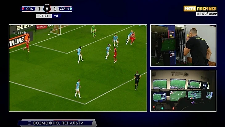 Главный судья Иван Абросимов не увидел нарушения. Ассистенты на ВАР пригласили арбитра посмотреть повтор момента. Проанализировав эпизод Абросимов принял решение назначить 11-метровый в пользу красно-белых.
