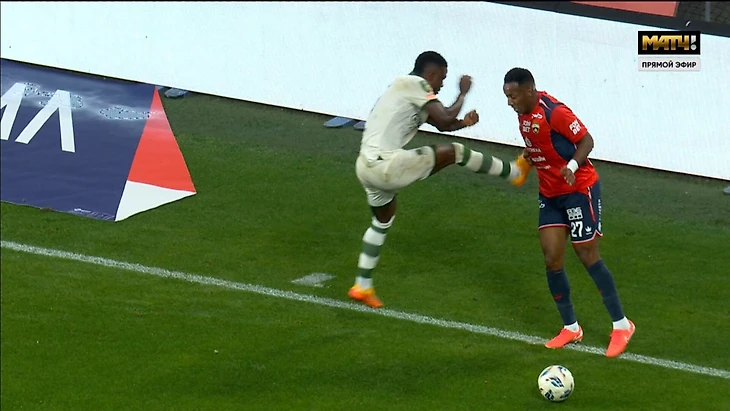 На 56-й минуте матча 7-го тура Мир РПЛ нападающий «Краснодара», проиграв борьбу за мяч у лицевой линии, пнул его в защитника армейцев Мойзеса Барбозу и заодно зацепил шипами его руку.