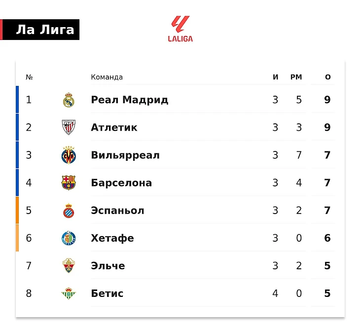 «Реал» и «Атлетико» набрали по 9 очков. У «Вильярреала» 7 очков и преимущество над «блауграной» по дополнительным показателям. Также 7 баллов набрал «Эспаньол» – он пятый.