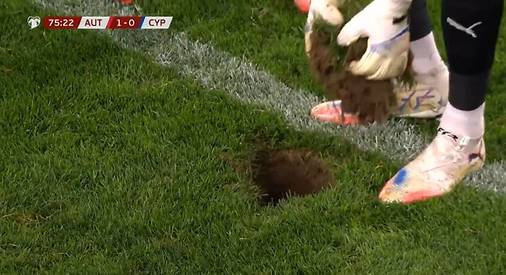 Из-за дыры в газоне глубиной 20 сантиметров прервали матч Австрии и Кипра в отборе ЧМ. Пауза продлилась 7 минут, пока яму не заделали