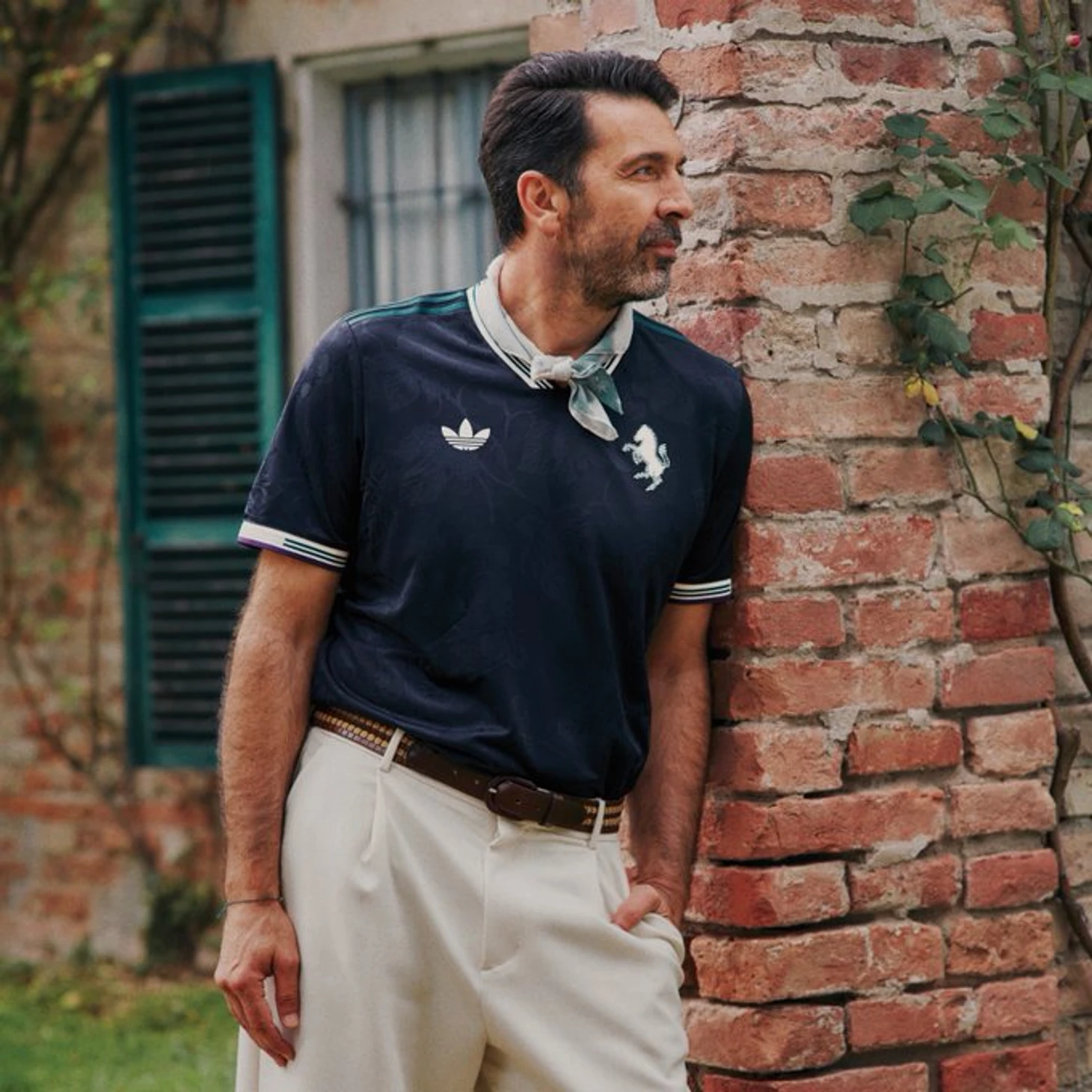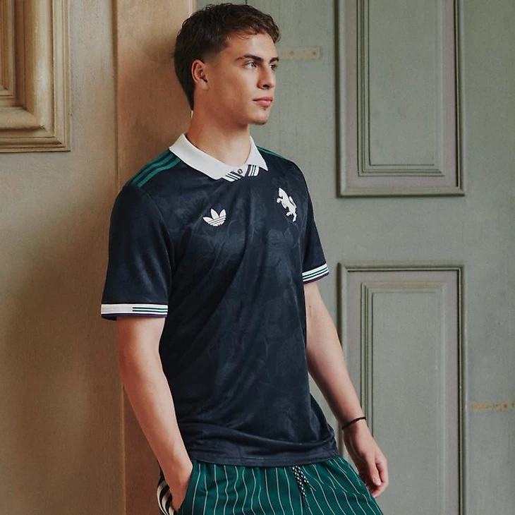 Футболки игроков украшены термоаппликацией с тремя полосками, термоаппликацией с эмблемой «Ювентуса» в виде зебры и культовым логотипом трилистника. Эти элементы дополняют V-образный вырез и манжеты из плоской вязки.