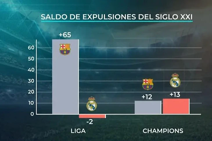 В эфире клубного ТВ «Реала» подсчитали, что в XXI веке баланс красных карточек у «Барселоны» в Ла Лиге составляет +65, в то время как у «Реала» отрицательный показатель -2. Это значит, что соперникам каталонцев показали на 65 красных карточек больше, чем «блаугране».