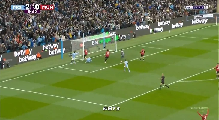 На 55-й минуте форвард «Ман Сити» пробросил мяч мимо вратаря «МЮ» Алтая Байындыра и пробил по пустым воротам из пределов вратарской площади. Мяч после удара норвежца попал в штангу, после чего его защитник манкунианцев Лени Йоро.