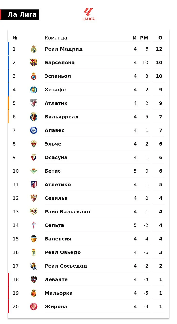 «Эспаньол» идет 3-м в Ла Лиге после 4 туров. У него и «Барсы» по 10 очков, «Реал» лидирует с 12 баллами, «Атлетико» – 11-й