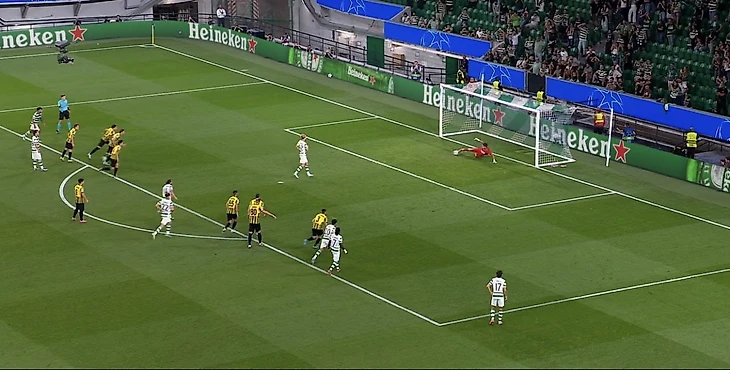 На 20-й минуте матча арбитр Дамян Сыльвестшак назначил пенальти в ворота «Кайрата» после фола Александра Мрынского на форварде португальцев Луисе Суаресе. Голкипер гостей Шерхан Калмурза отбил ногой удар с точки Мортена Юлманда.