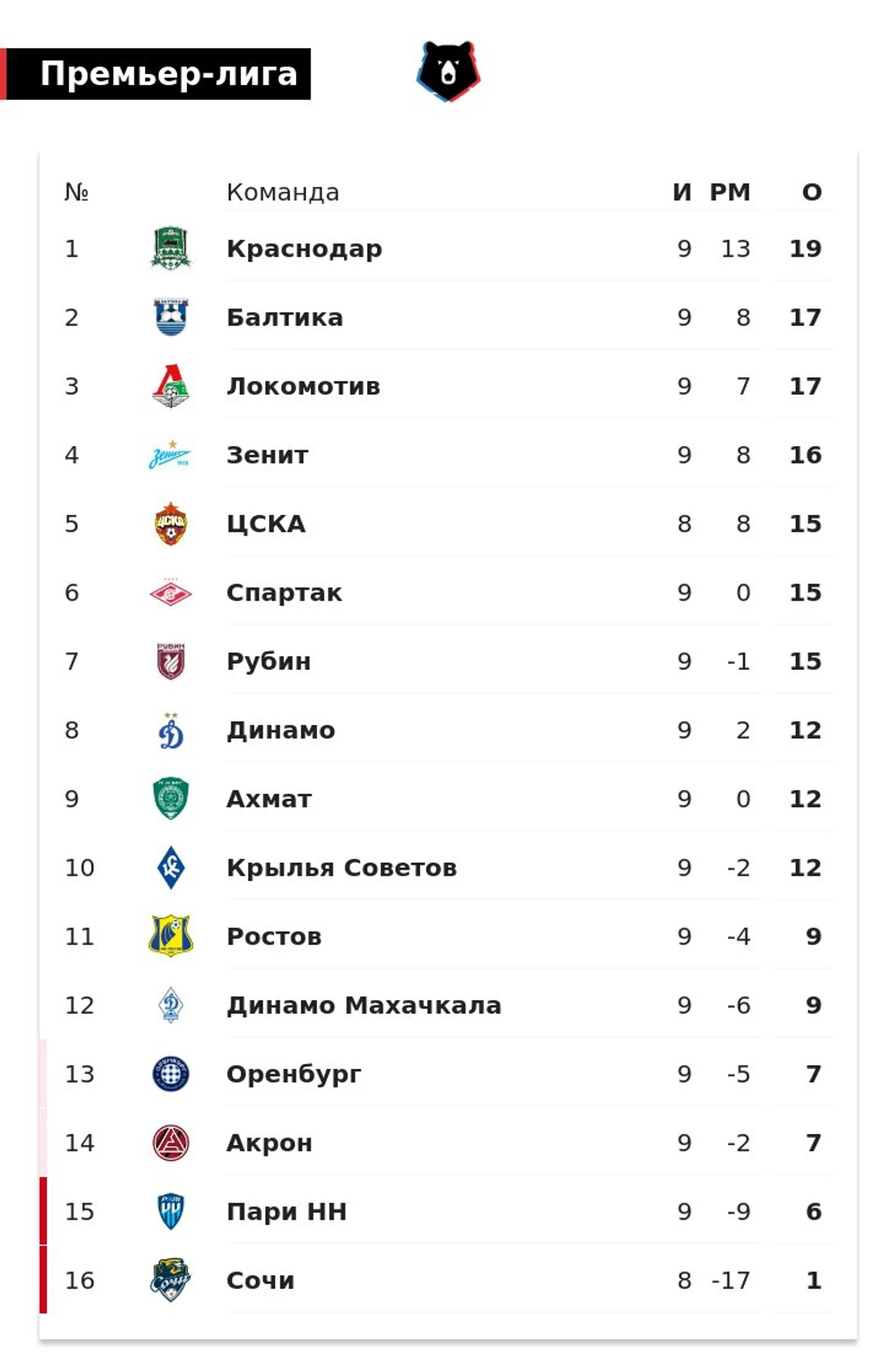 «Краснодар» продолжает лидировать в Мир РПЛ после 9 матчей.