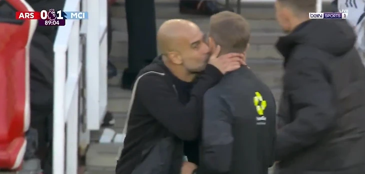 Гвардиола поцеловал резервного судью Поусона в щеку, обхватив его шею руками, незадолго до гола «Арсенала» «Ман Сити»