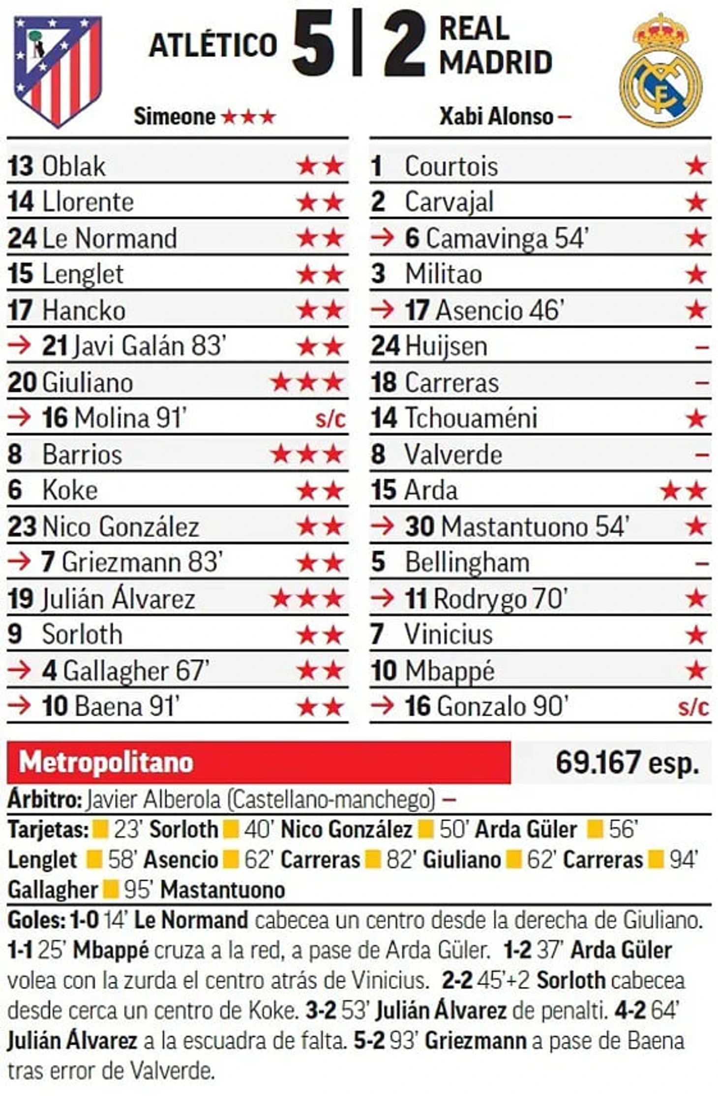 Альварес, Диего и Джулиано Симеоне и Барриос получили высшую оценку от Marca за дерби с «Реалом» – 3 звезды. У Алонсо, Беллингема, Вальверде, Хейсена и Каррераса – прочерк