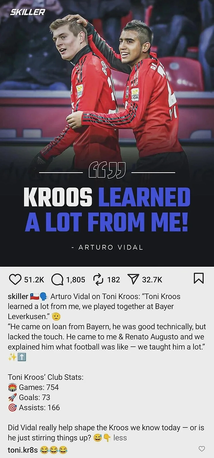 Бывший полузащитник «Реала» и сборной Германии оставил комментарий под постом с отрывком из интервью Видаля, в котором чилиец рассказал, как помогал Кроосу улучшить навыки с мячом во время их совместного выступления за «Байер».