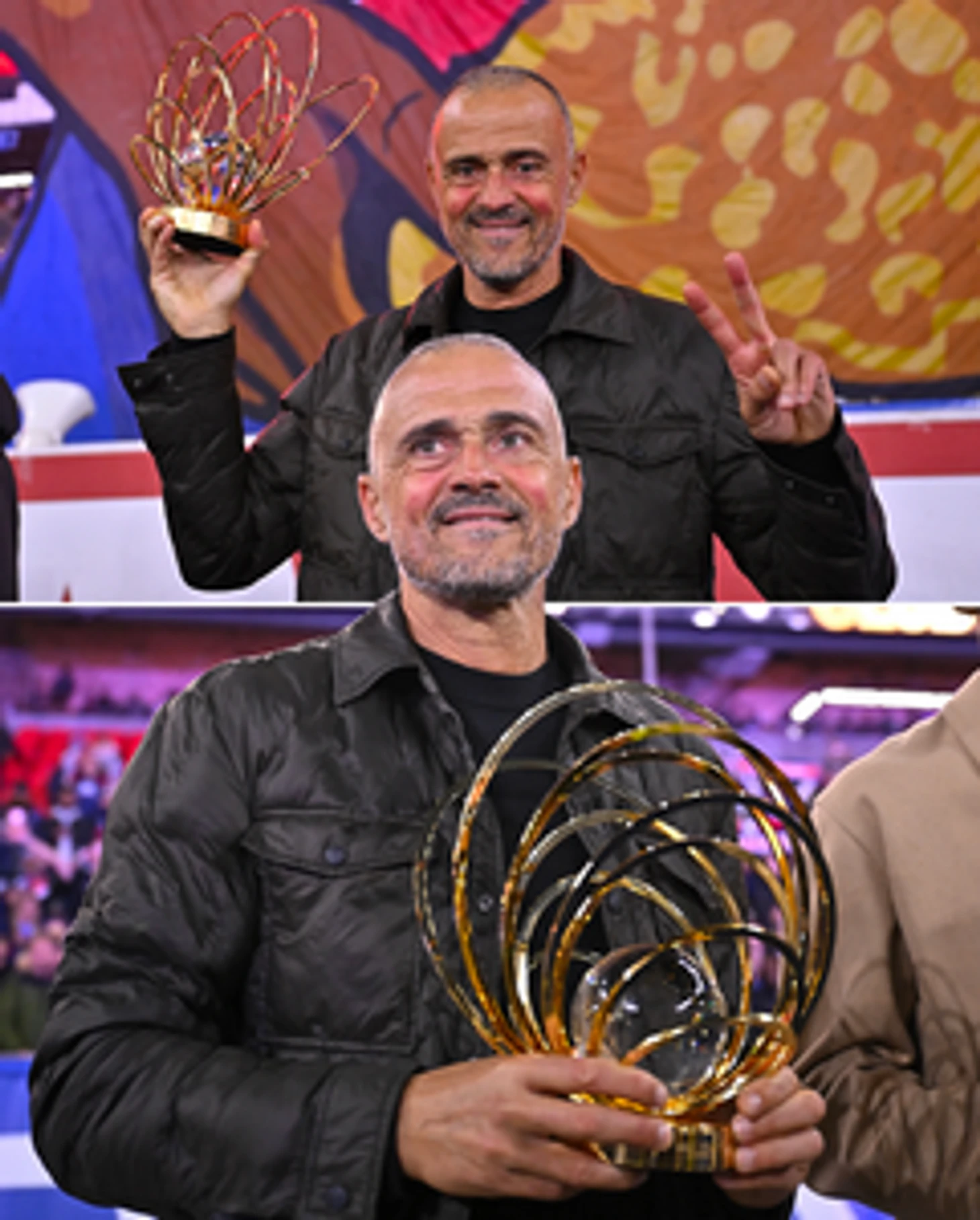 Луис Энрике показал болельщикам «ПСЖ» награду имени Йохана Кройффа, вручаемую лучшему тренеру мира.
