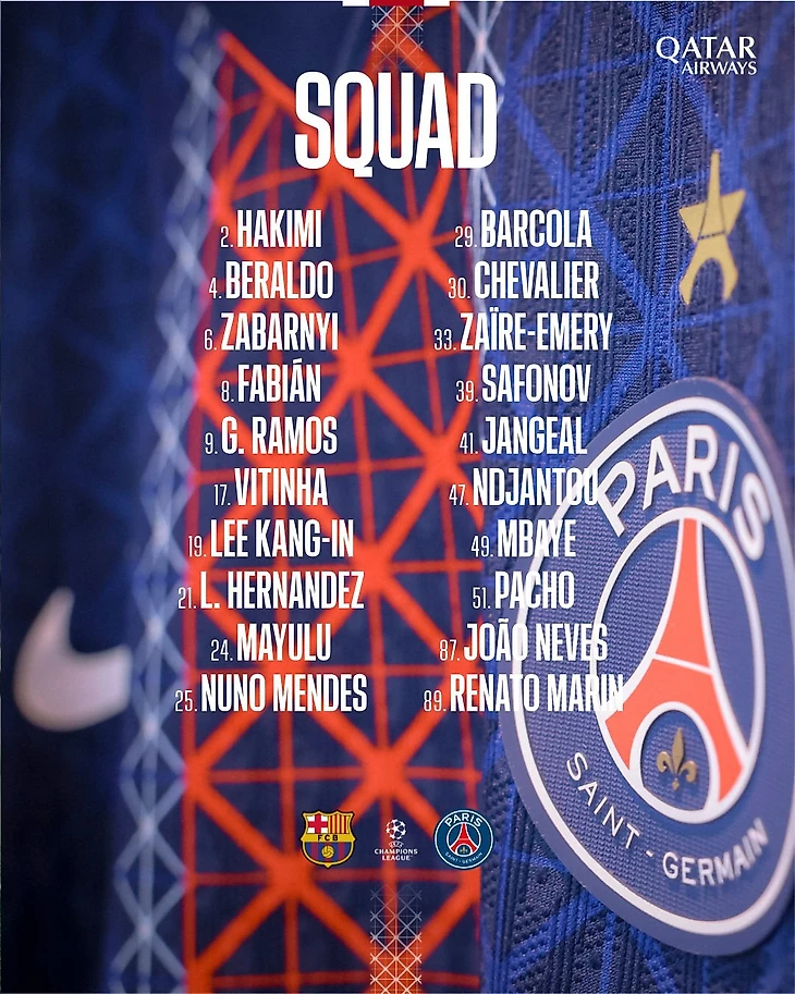 С «Барселоной» также не сыграют травмированные Усман Дембеле и Дезире Дуэ. Витинья, также замененный из-за поврежденияв последнем матче «ПСЖ», включен в заявку.